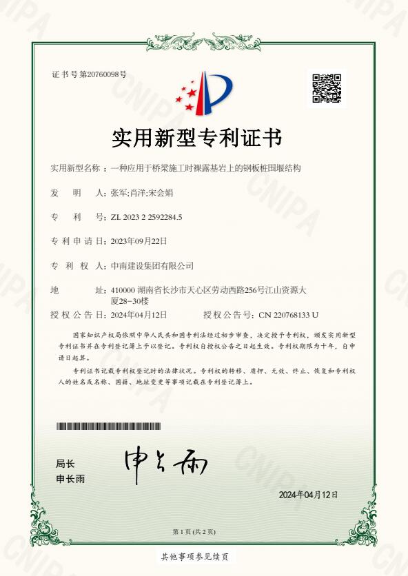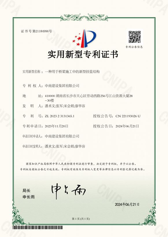 耒陽市大河邊渡改橋工程是中南建設(shè)集團(tuán)承建的是湖南省重點(diǎn)旅游公路項(xiàng)目。自開工以來,公司高度重視,集中優(yōu)秀人才和優(yōu)質(zhì)資源,不斷攻克施工難題,加強(qiáng)核心技術(shù)攻關(guān),推動(dòng)科技成果加速轉(zhuǎn)化,加快形成新質(zhì)生產(chǎn)力。4月,公司獲得國家知識產(chǎn)權(quán)局頒發(fā)的《一種應(yīng)用于橋梁施工時(shí)裸露基巖上的鋼板樁圍堰結(jié)構(gòu)》實(shí)用新型專利。近日,再獲《一種用于橋梁施工中的新型掛籃結(jié)構(gòu)》實(shí)用新型專利。兩項(xiàng)成果的獲得,既增強(qiáng)了公司在路橋領(lǐng)域的建設(shè)實(shí)力,提振了大家的信心,也為整個(gè)行業(yè)的科技進(jìn)步貢獻(xiàn)了中南智慧和中南力量。