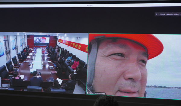 談文勝一行率先抵達(dá)物化所,在座談會(huì)現(xiàn)場(chǎng),談文勝與在菲律賓達(dá)沃-薩瑪爾跨海大橋樁基項(xiàng)目部的工作人員進(jìn)行視頻連線,親切交談。