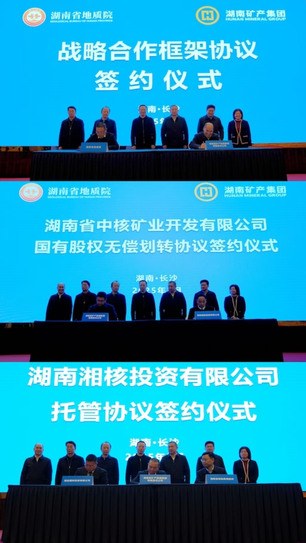 在與會領導的見證下,雙方依次簽訂了《省地質院與湖南礦產集團戰(zhàn)略合作框架協(xié)議》《湖南省中核礦業(yè)開發(fā)有限公司國有股權無償劃轉協(xié)議》《湖南湘核投資有限公司托管協(xié)議》。此次簽約,標志著雙方在礦產勘查、開采及開發(fā)利用領域將開啟全方位、深層次的戰(zhàn)略合作新篇章。這一合作不僅對于深化省地勘單位改革、實現(xiàn)事企分開與主輔剝離的改革任務具有重要意義,更將極大地推動礦產資源探、產、供、儲、銷體系的全面優(yōu)化與升級。通過合作,雙方將攜手為保障國家能源資源安全及重要產業(yè)鏈供應鏈的穩(wěn)定提供堅實支撐,為湖南礦業(yè)產業(yè)的高質量發(fā)展注入新動力。