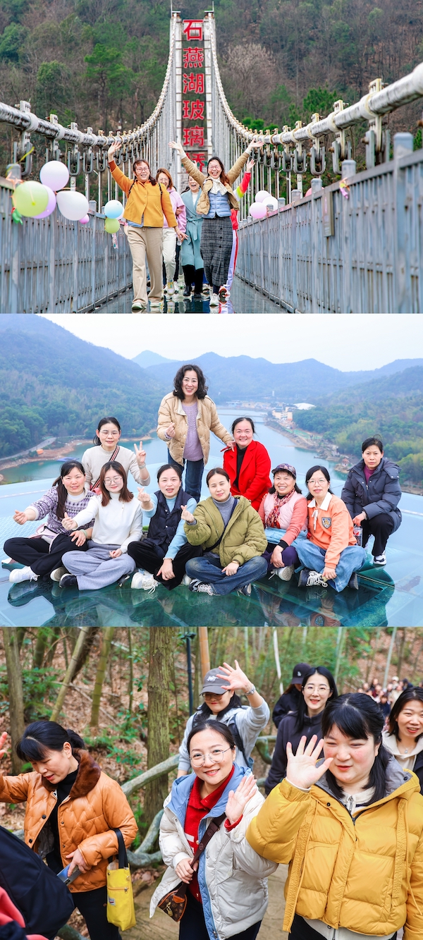 沿途,女職工們一邊欣賞著如畫的美景,一邊在玻璃橋、觀云橋、滕橋、天空之鏡、高空飛索等地標性景點前駐足留影。攝影師的鏡頭捕捉下了每一張笑臉,定格了每一個美好的瞬間。經(jīng)過兩個小時的徒步,女職工們順利抵達終點,并領(lǐng)取了地質(zhì)院特制的文創(chuàng)書簽作為紀念。