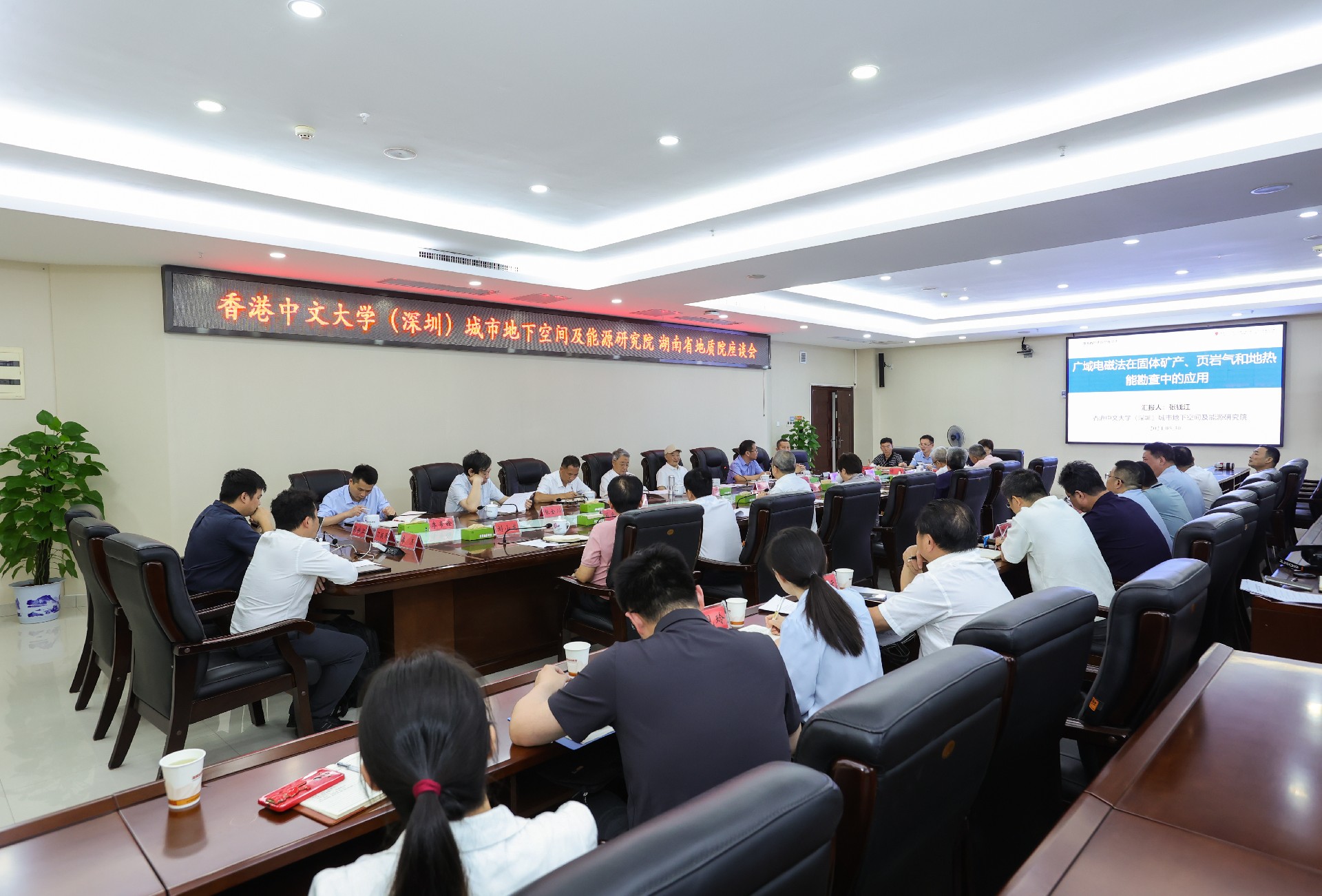 座談會上,雙方互相介紹了單位基本概況、改革發(fā)展、人才隊伍建設(shè)、科研成果及平臺、對外合作、海外地質(zhì)、典型項(xiàng)目等情況。香港中文大學(xué)(深圳)城市地下空間及能源研究院5位專家學(xué)者分別圍繞廣域電磁法在固體礦產(chǎn)、頁巖氣和地?zé)崮芸辈橹械膽?yīng)用,新型地球物理探測裝備商業(yè)化推廣應(yīng)用,湖南省中深層地?zé)崮苓x區(qū)與評價建議,湖南省煤系氣及伴生綠色能源地質(zhì)選區(qū)與資源評價,煤地下原位氣化(制氫)及碳封存技術(shù)等課題進(jìn)行了學(xué)術(shù)交流。雙方就發(fā)揮各自優(yōu)勢,在數(shù)字地質(zhì)建設(shè)、堤壩管涌隱患檢測、城市地下空間、設(shè)備升級改造、中深層地?zé)崮芸碧介_發(fā)與利用、地質(zhì)研究與工程一體化、人才交流培養(yǎng)、打造科研團(tuán)隊、建立產(chǎn)學(xué)研用及長期合作機(jī)制等方面探討了契合點(diǎn)并達(dá)成合作共識。